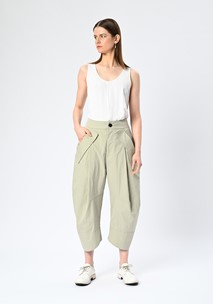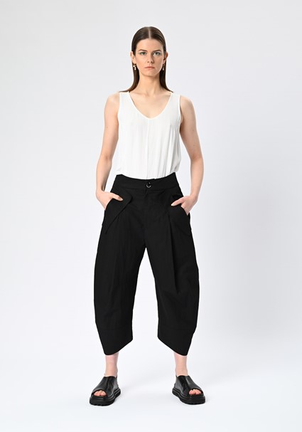 - Relaxed crotch with deep front tucks for a slouchy, fluid silhouette
