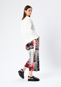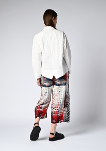Wear the CBD Shirt over slim trousers or leather leggings for a sleek, layered look, letting the signature tails swing freely for movement and impact. Pair with minimal boots or sculptural mules to highlight the architectural hemline, and accessorise with bold metallic jewellery or a structured belt to accentuate the waist and elevate the relaxed silhouette. For a modern edge, layer over a fitted dress or skirt to play with contrasting proportions.