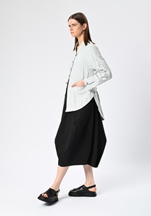 The District Detachable Panel Jacket combines sharp tailoring with modern asymmetry, featuring an asymmetric button front closure and a semi-tailored fit through the body. Curved hem shaping at the front and back, paired with a longer back hem, creates subtle movement, while a French seam enhances the jacket’s sculptural lines. Adjustable shaping through the back waist with a "D" ring and belt allows for a personalized silhouette that complements a variety of body types.
