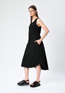 This dress is a statement in itself — wear it cleanly with minimalist sneakers or flat sandals for day, then shift to structured boots for the evening. The drawcord waist lets you play with silhouette, while the asymmetrical pockets and raw hem detail lend an effortless edge that pairs beautifully with layered outerwear or cropped jackets.