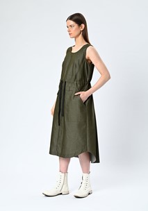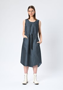 This dress is a statement in itself — wear it cleanly with minimalist sneakers or flat sandals for day, then shift to structured boots for the evening. The drawcord waist lets you play with silhouette, while the asymmetrical pockets and raw hem detail lend an effortless edge that pairs beautifully with layered outerwear or cropped jackets.