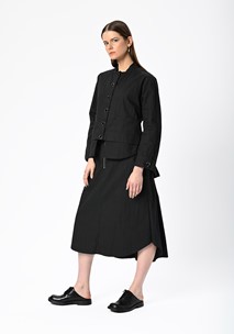 Layer this jacket over cocoon-shaped trousers for a sculptural silhouette, or pair with a fluid skirt for a directional play on proportion. Its adjustable back shaping allows for both sharp, defined lines and relaxed, undone styling, making it a versatile addition to a modern wardrobe.