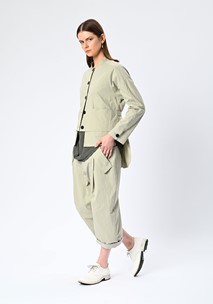 Layer this jacket over cocoon-shaped trousers for a sculptural silhouette, or pair with a fluid skirt for a directional play on proportion. Its adjustable back shaping allows for both sharp, defined lines and relaxed, undone styling, making it a versatile addition to a modern wardrobe.