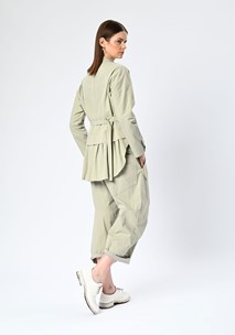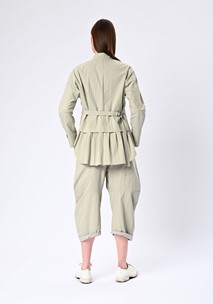 At the back, adjustable shaping through a belt and D-ring adds versatility, allowing you to wear it cinched for definition or loose for a more relaxed drape. Welt pockets at the front provide function without disrupting the clean finish, while a CB French seam and raw-edged back hem nod to MM Söhn’s signature balance of precision and deconstruction. The folded tuck detailing at the peplum completes the design with subtle texture and dimension.