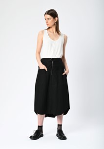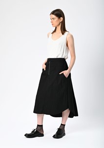 Functionality meets detail with carefully placed features, including folded tuck detailing on the back, asymmetric pocket design, and an exposed zipper closure for a directional finish. The elastic insert at the back waistband ensures comfort without sacrificing structure, while top stitch detailing enhances the skirt’s tailored construction.