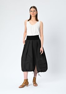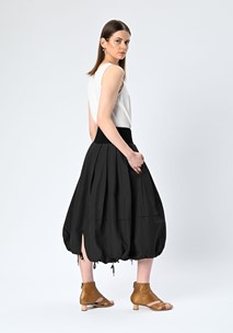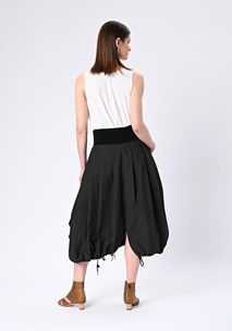 Milieu Skirt – playful volume with tucks, elasticated cotton-Lycra waistband, adjustable hem, and hidden pockets. Versatile, sculptural, and effortlessly wearable.