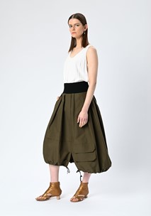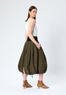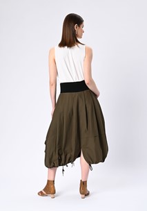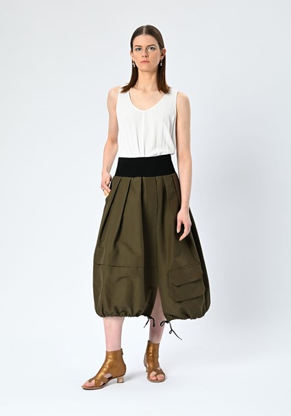 Milieu Skirt – playful volume with tucks, elasticated cotton-Lycra waistband, adjustable hem, and hidden pockets. Versatile, sculptural, and effortlessly wearable.