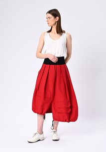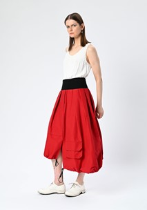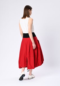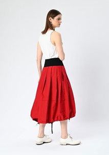 Milieu Skirt – playful volume with tucks, elasticated cotton-Lycra waistband, adjustable hem, and hidden pockets. Versatile, sculptural, and effortlessly wearable.