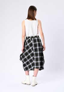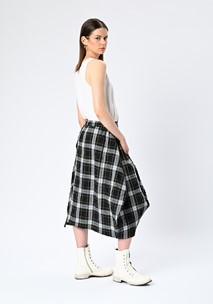 Style the Streetscape Skirt with a fitted top or cropped knit to highlight its sculptural volume, or pair with a relaxed shirt tucked just at the front for effortless balance. Add pointed ankle boots or platform sandals to accentuate the asymmetric hemline, and layer with a structured jacket or cropped shrug for an editorial finish. Keep accessories clean and directional—think matte metallics or geometric shapes—to underscore the skirt’s modern architectural aesthetic.